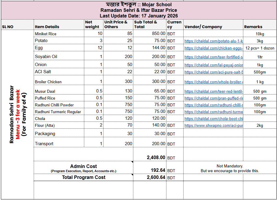 Sehri & Iftar Bazar For A Week (Package-3) Posted on 02/02/2026 by Fariya Islam Share this post: Facebook Twitter LinkedIn WhatsApp Telegram